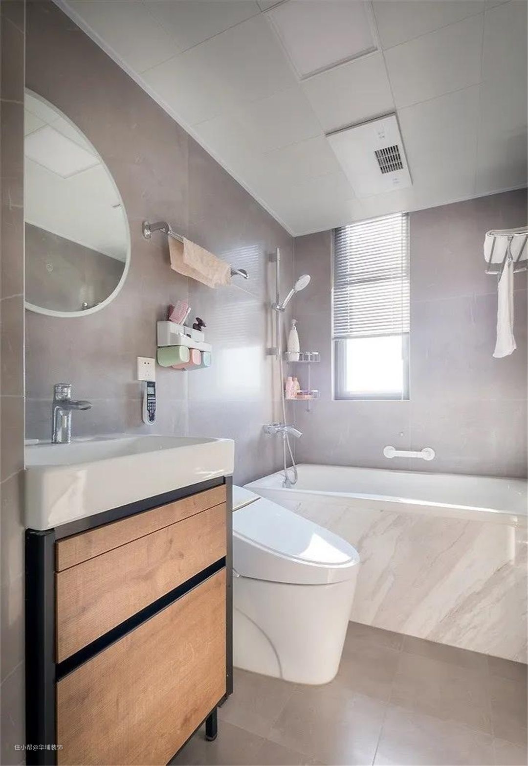 洗手间没有夸张的装饰,磨砂材质的墙砖与地砖,让空间显得精致。