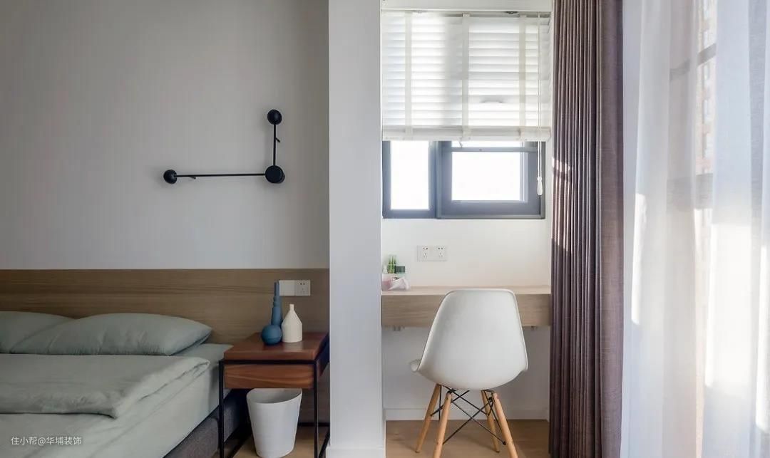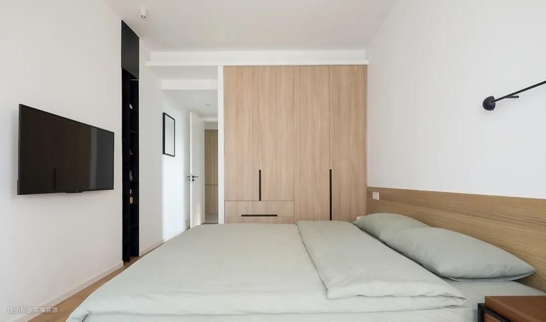 原始户型阳台墙体影响采光,拆除墙体,增加通透性。2米长的床加上一个靠背,过道显得十分拥挤。设计师把靠背替换成了一个矮木饰面背景,简单有序,方便实用。