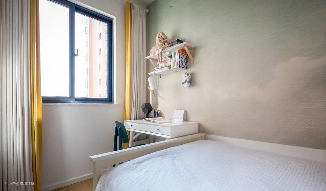儿童房空间较小,但设计蛮温馨。床头用云朵壁纸很有童心,符合孩子天真烂漫的天性。床头摆放小书桌,供女儿读书写字。