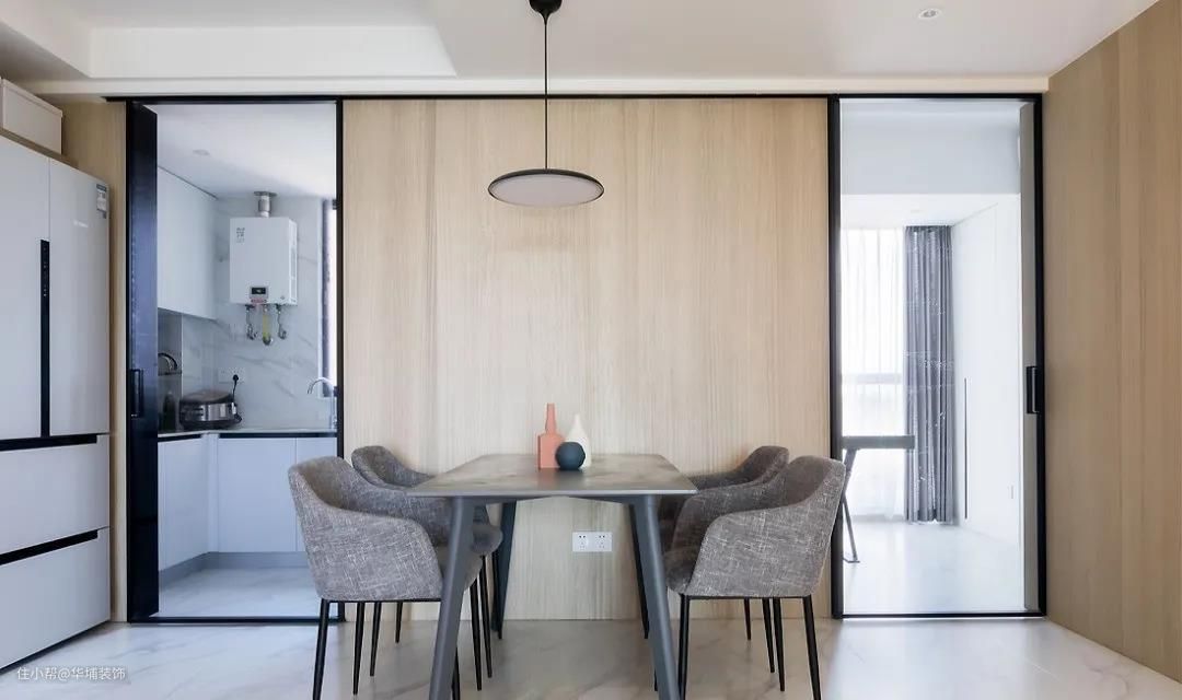 厨房与餐厅紧密相连,用一扇玻璃推拉门做隔断,保证通透的同时尽显大气。厨房空间有限,冰箱只能外放。设计嵌入式冰箱最大程度节省空间,与橱柜风格相统一,大气美观。