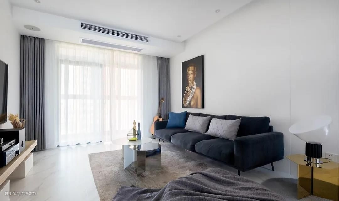 宝石蓝色的沙发提升质感,温柔细腻。灰色的窗帘彰显了高级感,同时呼应蓝色,慵懒、静谧,带来极度舒适的视觉享受。