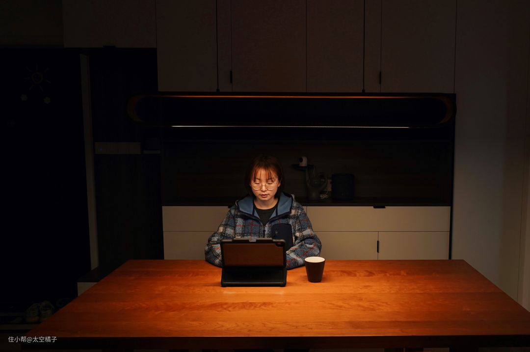 在装潢的时候,特地挑了长桌,方便晚上回家处理工作上事情,有着音乐和灯光陪伴,工作效率都会高不少。