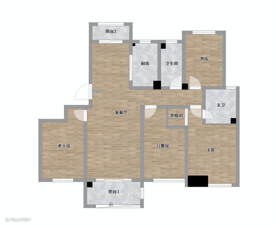 我家的房型是基本上是这样,个人活动最多的三个区域可能就是「客餐厅」、「主卧」以及在家SOHO用的「书房」。