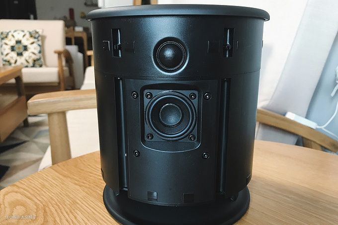 M5的面罩也是可以拆下的,正面是一颗1.5英寸的中音扬声器,然后音箱顶部有三个3/4英寸高音扬声器,分布的位置呈等边三角形形状;5英寸的低音则是直接面向桌面,效果太足了。