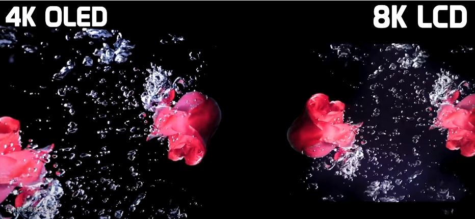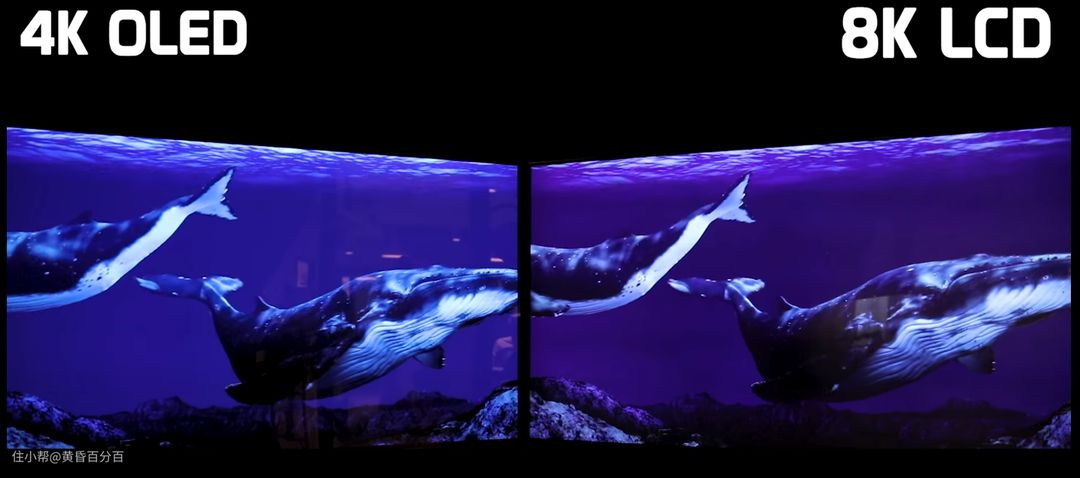 ▲国外UP主去LG的体验厅拍摄的视频截图,左边为4K的OLED 右边为8K的LCD,可以很清楚的看到,OLED电视完全没有任何的“漏光”现象,毕竟OLED是直接控制发光二极管的亮灭,没有使用背光光源,所以根本不可能有任何的漏光。而右侧的LCD电视,最下方气泡处明显可以感受到黑色与其他地方一致,这就是漏光导致的,即使老牌如LG,在LCD面板的品控上也无法做到完全不漏光,就更别提二线,三线品牌所生产的LCD屏幕了。