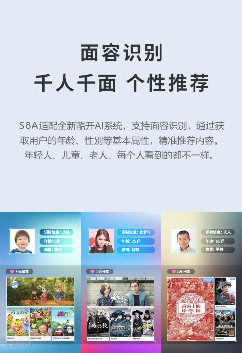 ▲同时,电视系统也更加智能,提供了面部识别功能,从而做到推荐内容千人千面,不会出现给老奶奶推荐喜羊羊这种傻事。同时,创维S8A支持AI语音操作,方便给不会操作智能系统的长辈们。