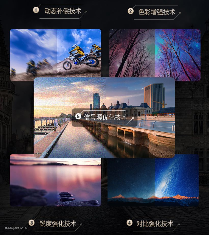 ▲飞利浦 OLED784搭载了飞利浦P5画质增强引擎,可以在动态补偿,色彩增强,锐度强化,对比强化,以及信号源优化这5个方面增强画面。