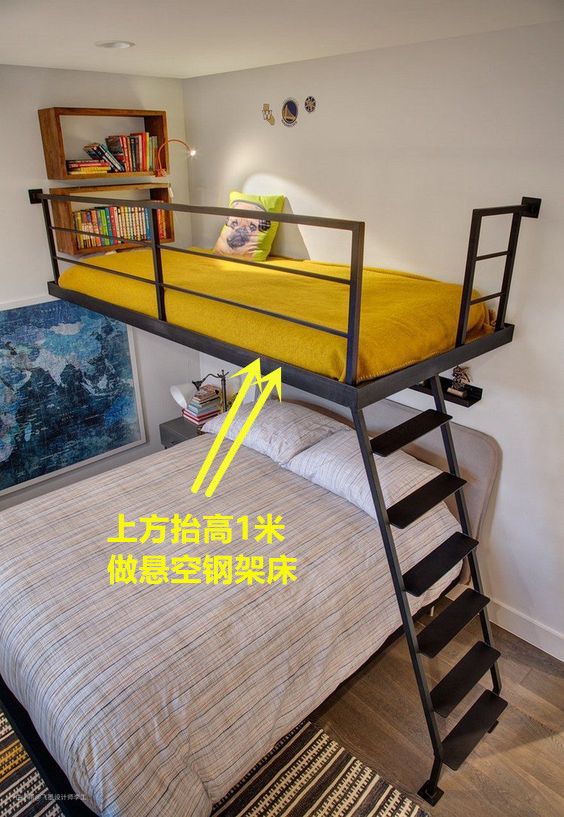 最后还是听了朋友的建议,决定在卧室大床的上方,抬高1米,加个钢架悬空床。这就是跟孩子睡上下铺了,想想还是蛮有趣的。