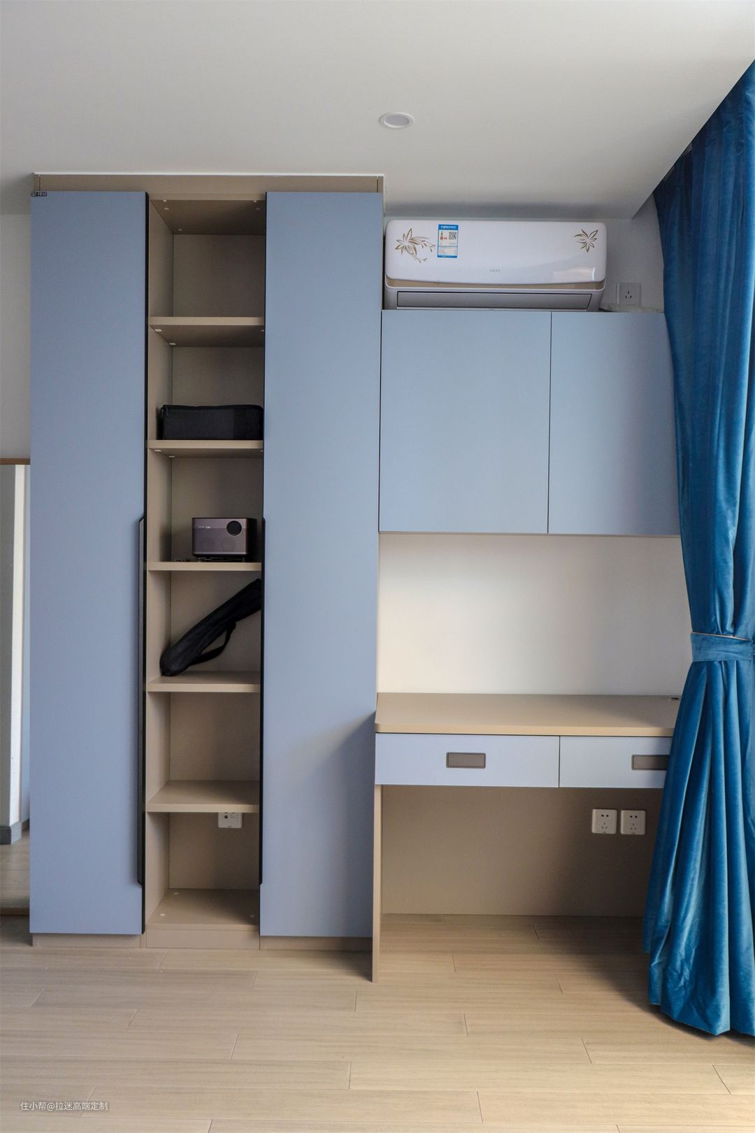 全屋以很纯粹的灰蓝色为基调,衣柜、书柜、橱柜甚至是房门,将这种优雅、静谧的色调,应用于一个充满灵性的家居空间,既能玩出时尚简约的潮范儿,又能呈现随性慵懒的感觉。