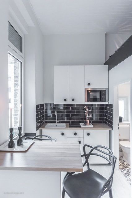完全采用黑白的小型工作室公寓- 储藏室厨房也被设计为与之匹配。由黑色地铁砖块和大的黑色旋钮制成的防溅板在原本明亮的利基位置设置了重点。后壁具有光滑的表面,可以反射光线,而深色的对比区域则可以增加深度。甚至还有余地建到了墙上的柜台服务作为厨房的休息区