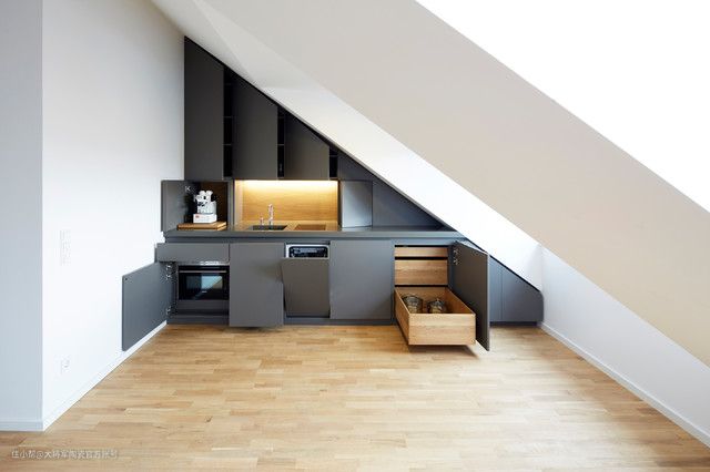 在此阁楼厨房中,每厘米均得到最佳利用。Holzrausch设计和制造的厨房排坐在倾斜的屋顶上。亚光灰色烤漆前面板的简单设计,有些带有凹入式把手,有些带有尖头配件,可隐藏冰箱,洗碗机和烤箱