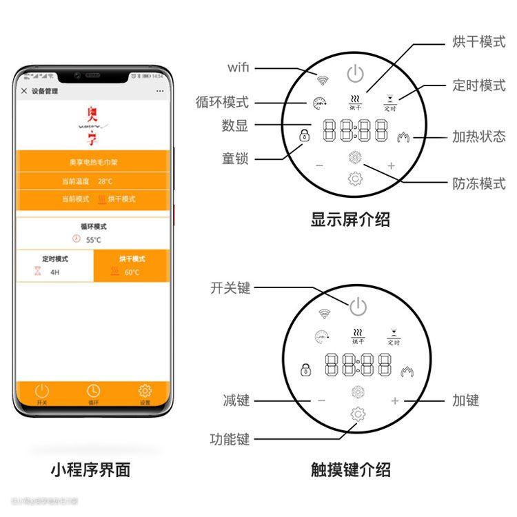 传统的电热毛巾架还处于近距离手动操作,现在的已经升级了,果然是给“懒人”设计的,打开手机小程序,与电热毛巾架配置成功马上就能连上。选择烘干模式,加热模式,循环模式操作就很棒了。最厉害的要数循环模式,能够提前预约时间日期,到了约定时间电热毛巾架就会自动继续工作啦。外带一个童锁功能,同时按住加减键五秒钟就会无法控制WiFi温控器页面,再按一次加减键又能恢复了。