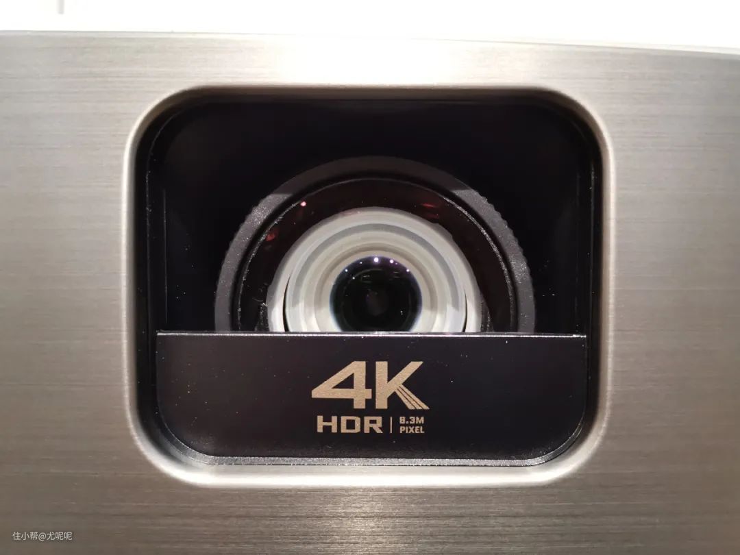 镜头由8组10片全玻璃镜头组成,玻璃镜头的透光性和表现力要优于树脂镜头。镜头下方的铭牌,明确的展示出这款机器是真4K投影,并且还支持HDR模式。