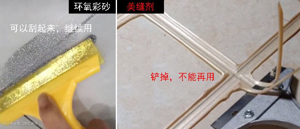 虽然环氧彩砂价格会高点,但是环氧彩砂可以全部填入缝隙当中,而美缝剂产生的废料很多,大概一瓶的美缝剂要浪费掉1/3。厚匠曾经见过,铲出来的美缝余料堆了整个涂料桶。