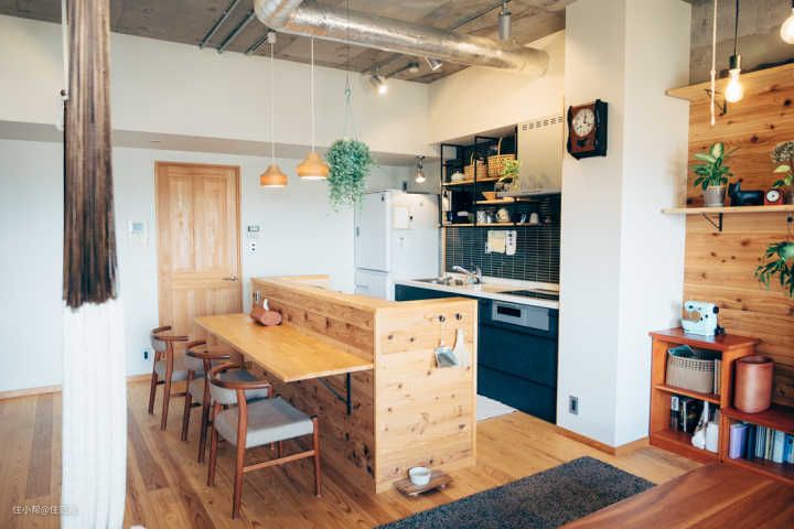 日本厨房基本是“二型”布局,一面橱柜靠墙,一面橱柜做成中岛。