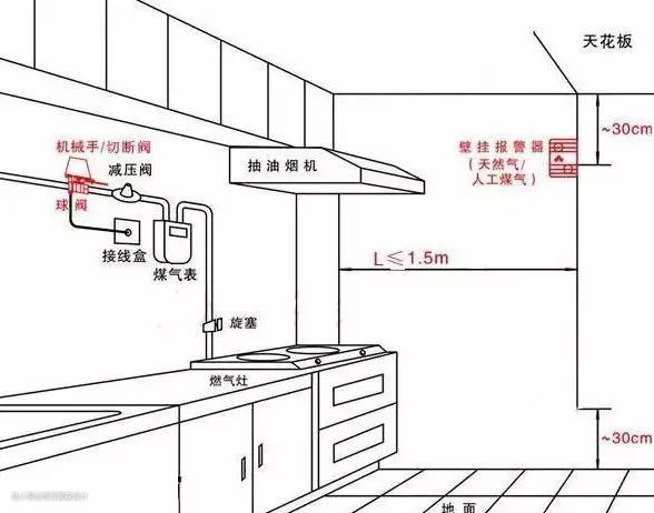 ▲注意事项:电源插座、电源开关与天然气管道不得交叉,水平净距离不小于150mm;燃气表、燃气阀门及管道接口正上方不应有电源插座。