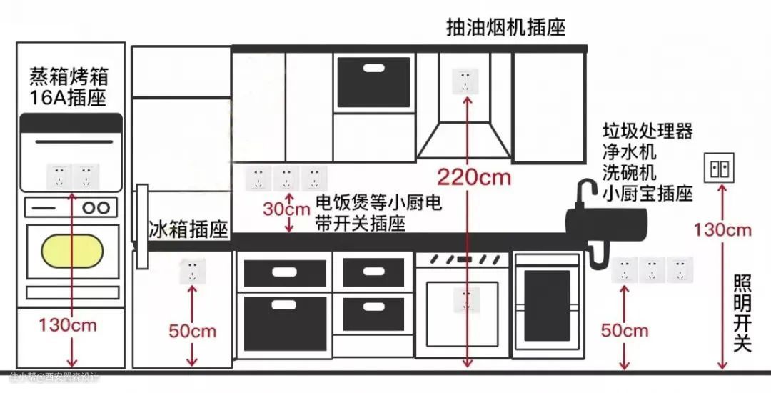 关于厨房插座的高度设计,我们用一张图来表达: