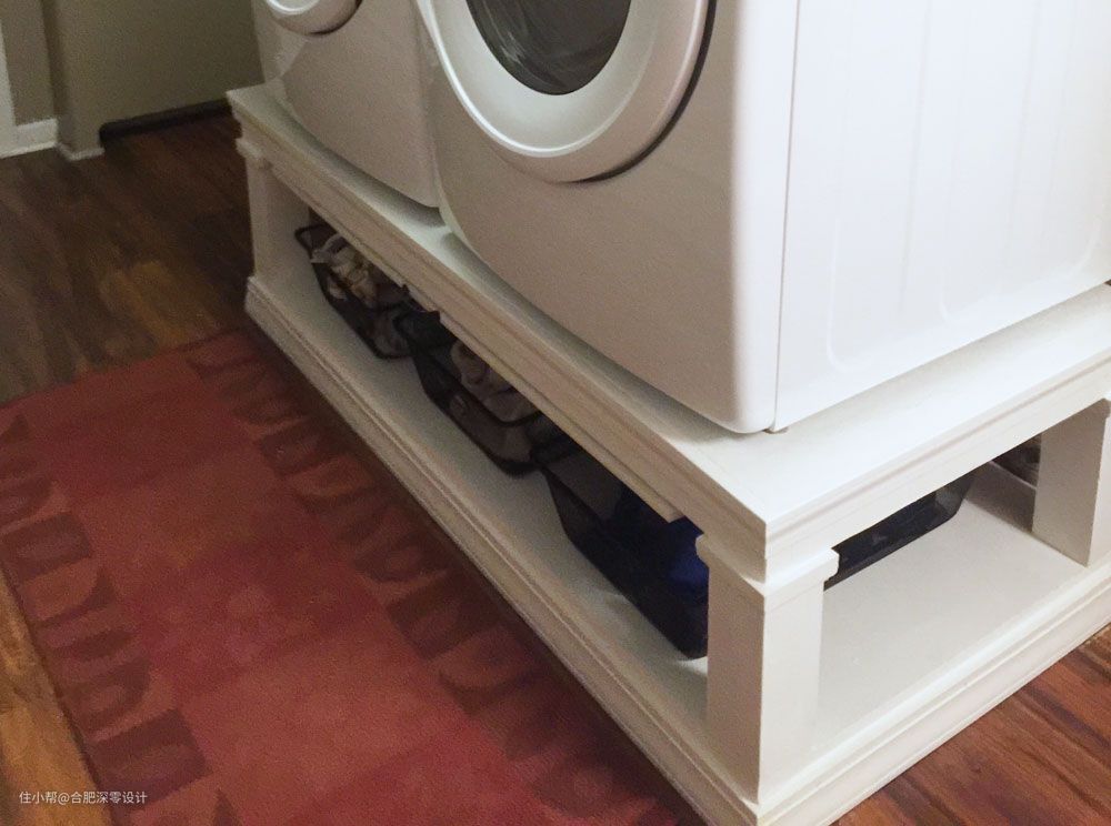 洗衣机下加个底座,除了拿取方便,也增加了收纳空间,底座留空的地方即便不放收纳篮,也能放些常用的洗脸盆、洗脚盆等。