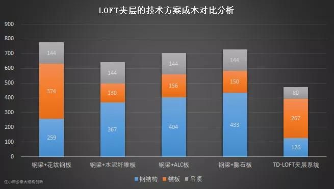 这5种系统中,前4种方案是结构、铺板两道工序,其中花纹钢板+细石混凝土铺板是造价最高的一种。而TD-LOFT系统是集成构件,结构与板合二为一,不需另行铺板,故造价低。
