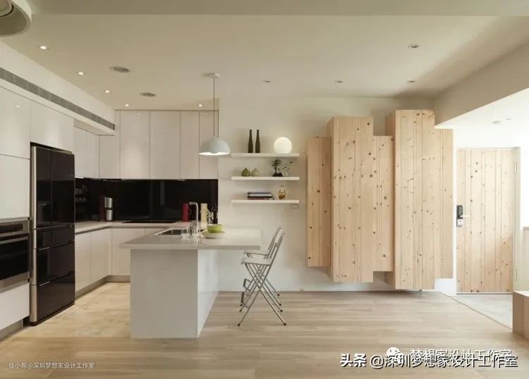 (1)如果家里空间比较紧凑,特别是厨房空间比较小,又无法在空间上区分厨房和餐厅的区域。这个时候就可以考虑L型岛台+餐桌的整合方案。L型(或T型)中央岛台的设计,就能满足各种大小空间的需要。