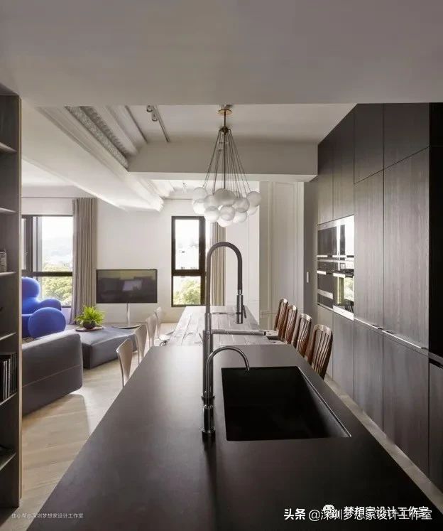 (3)如果是面积较大的户型,也可以另外设计独立的烹饪区,再把与烹饪相关的收纳和厨房设备整合在一起;其余的例如水槽区域,和操作区域就可以独立的放在岛台上。这样就可以在L型的短边整合烹饪区域,L型的长边就可以和餐桌整合在一起,设计出独立的就餐区域。