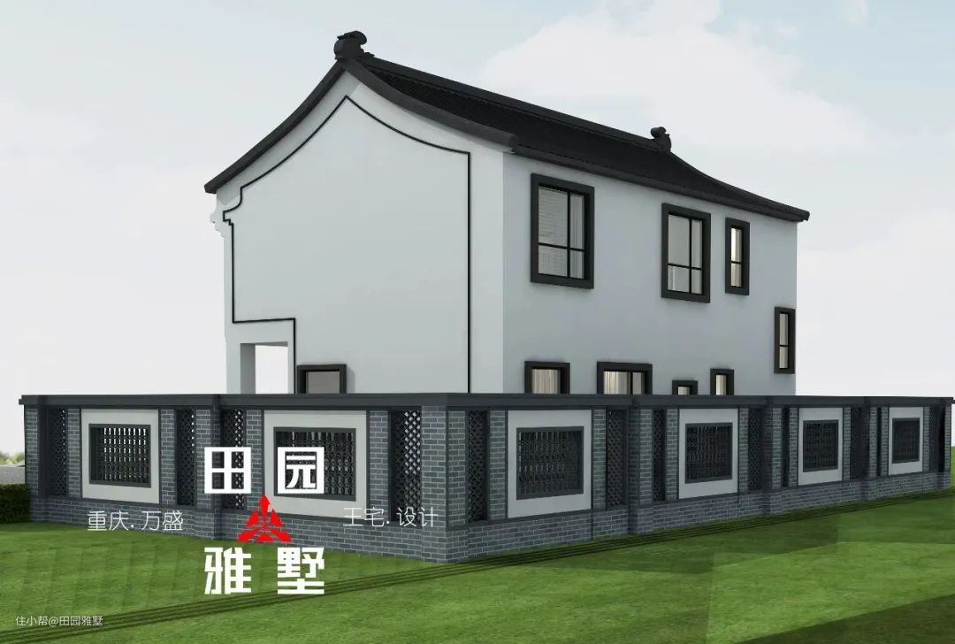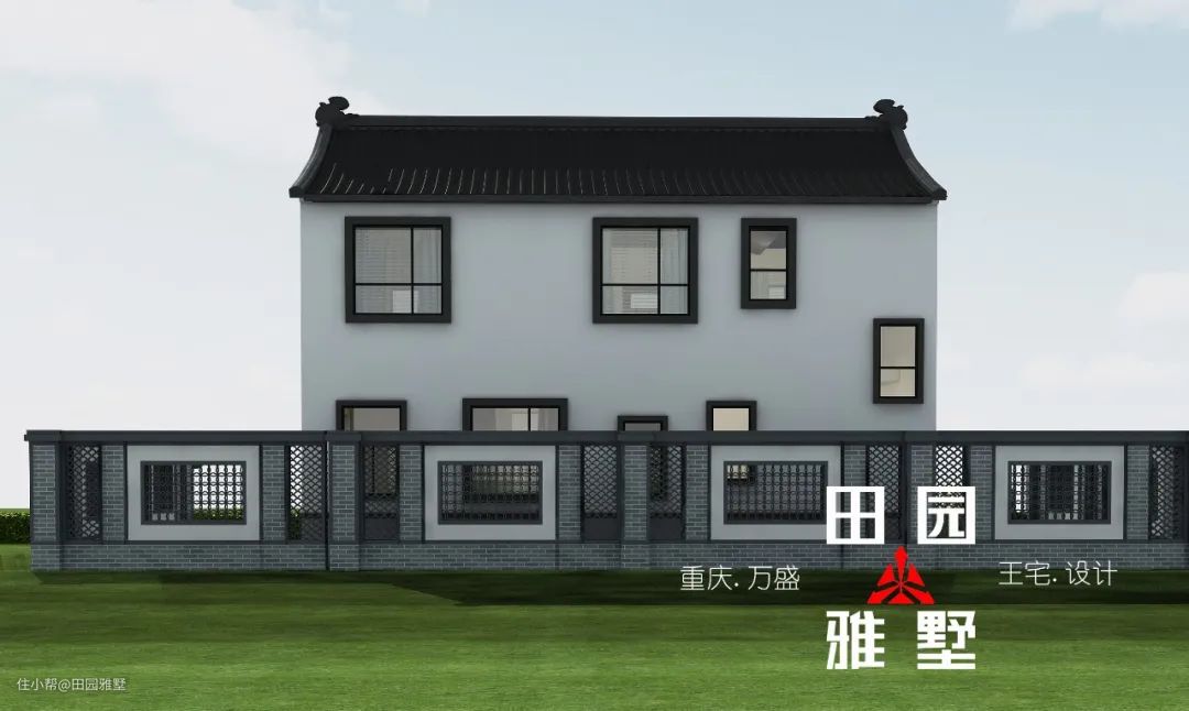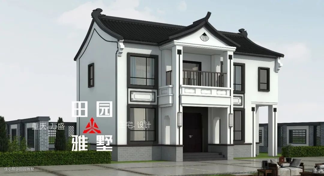 整体为中式风格,白色真石漆搭配黑色屋面瓦和中式装饰构件形成具有传统韵味的中式造型。