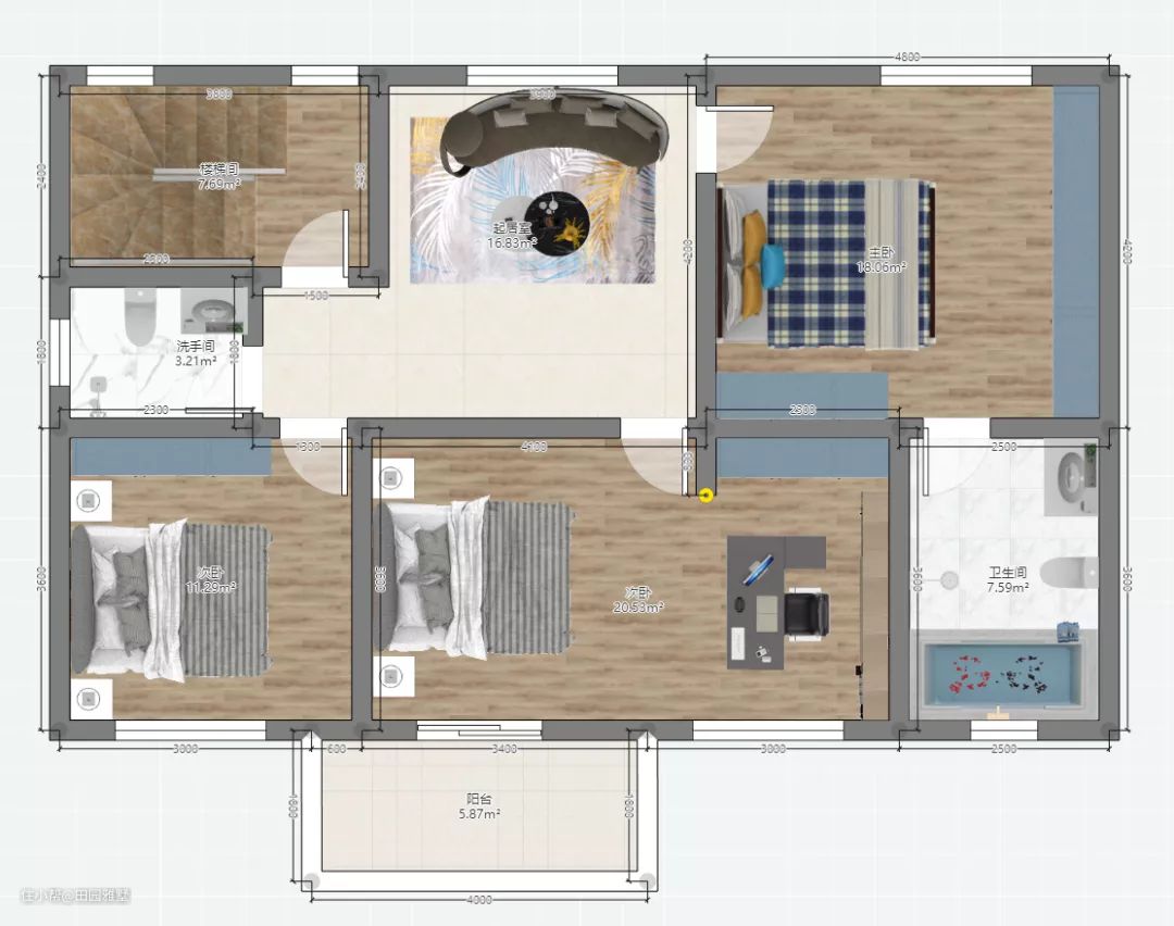 3:二层三个卧室和一个起居室,次卧面积大