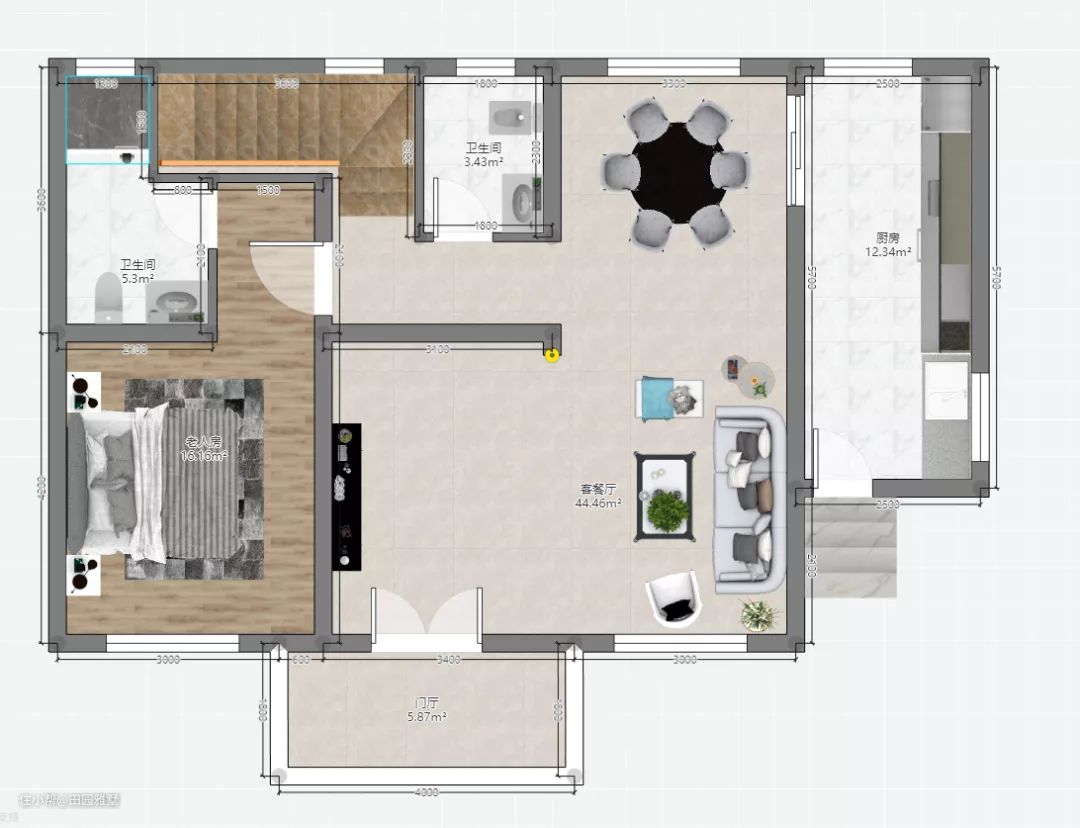 一层以接待功能为主,入户可从厨房与门厅进入室内,厨房位于右侧,与餐厅相邻,客厅空间开阔明朗,老人房配有私卫,方便老人生活起居。