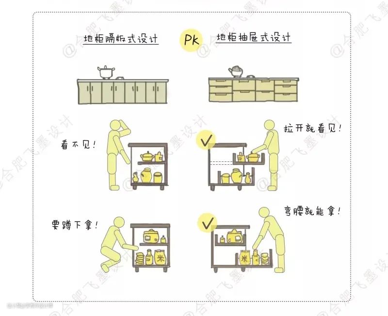再来看橱柜的地柜,地柜的高度就是前面说的台面高度,不再多说了。咱们来看看地柜的储物空间怎么设计才能更方便使用。