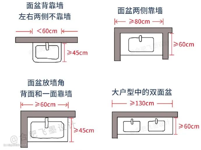 洗漱区台面的高度计算公式:洗手台高度=家庭平均身高/2-10cm。