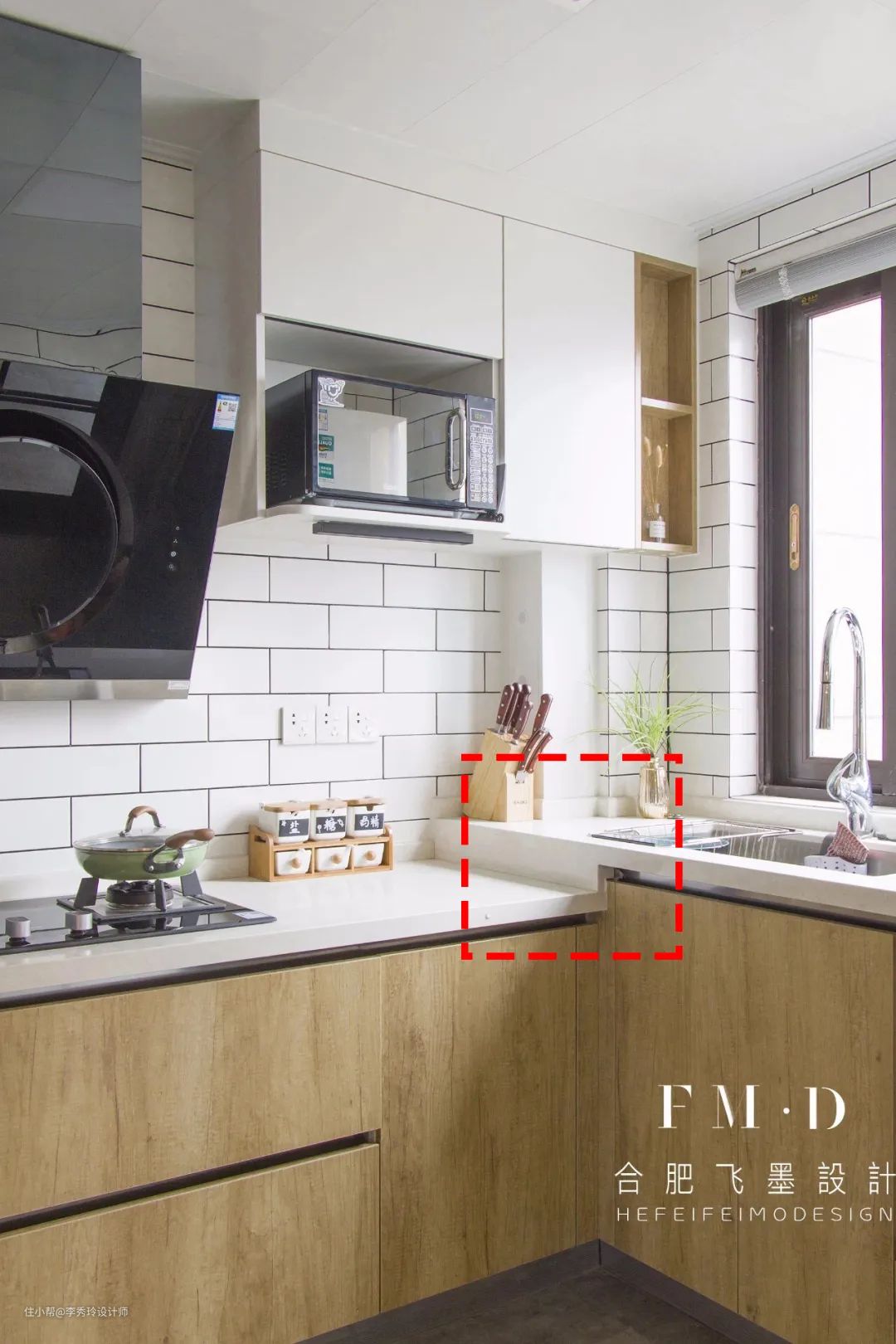 由于洗菜切菜的动作,与炒菜烹饪的动作有很大不同,所以在整体台面高度的设计上,建议使用高低台,水槽备菜区比烹饪灶台区高5-10cm,这样洗菜切菜不用弯腰,炒菜时候不用架着胳膊: