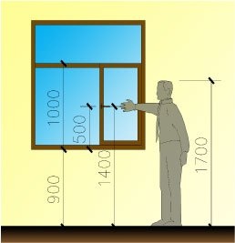 另外,我们在关注窗户太大的问题的时候,常常只关注宽度,其实高度也很“致命”。对于一般的外平开窗来说,在窗台高度一定的情况下,窗扇越高,开启把手的位置也会越高,而在“伸臂→俯身”这个开窗动作过程中,人手所能达到的高度是呈现下降趋势的。所以,窗扇太高、把手太高,会加大操作的不便。身高1.6~1.7m的普通人,手臂平伸的高度约为1.4~1.5m,按照普通窗台0.9m高考虑,1.0~1.2m是开启扇的合理高度。