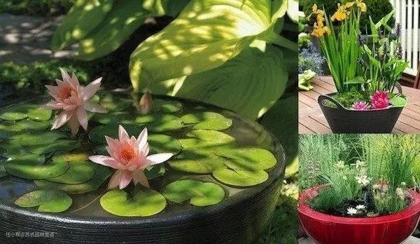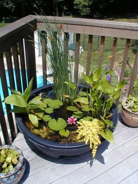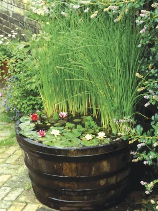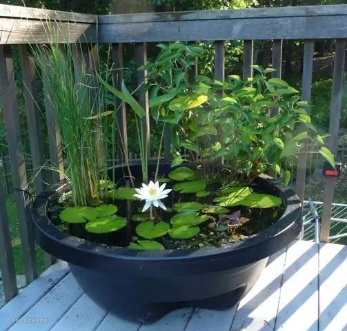 一个躺在地下室或小黑屋中、被遗忘的传统的木桶、水缸或小旧船(如果空间足够大的话),甚至是混凝土制作的水槽也可以,再次使用它们,将它们变成阳台的小池塘。