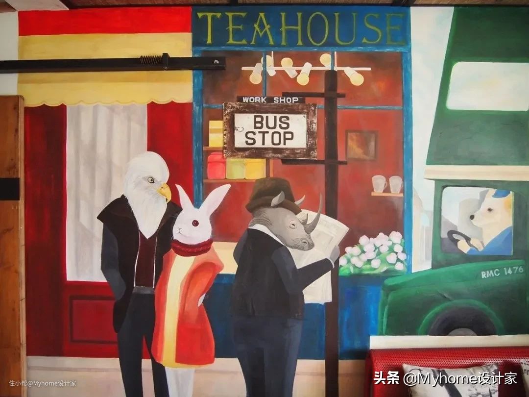 米米跟老公将老旧国宅改造成民宿,由老公负责木工的装修,她则是在布置细节上用心,像是大门进来这片油漆墙,就是拥有美术背景的她,断断续续花费约2个星期绘制而成,而电表箱在她的创意发挥之下,毫无违和地变成画中的公车站牌,即便不覆盖电表箱也能达到修饰的目的。