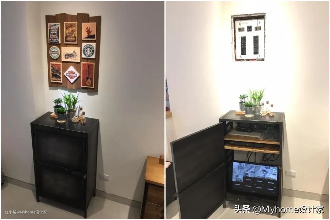 网友小志本身是理工科出身,没有装修背景的他利用一块栈板将电表箱做修饰,并使用强力磁铁,将一片片杯垫及隔热垫固定于其上,让它不只是美观,还兼具功能性。监控器主机、NAS服务器则收纳于下方的造型铁箱中,铁箱是他请铁工焊制的,自己再涂装成复古的风格。