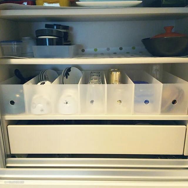这是使用无印良品的亚克力货架增加收纳空间的方法,尽量避免浪费空着的空间。另外,下层空间,利用文件盒将餐具立起来了。尺寸也可以选择适合餐具的,防止翻滚。