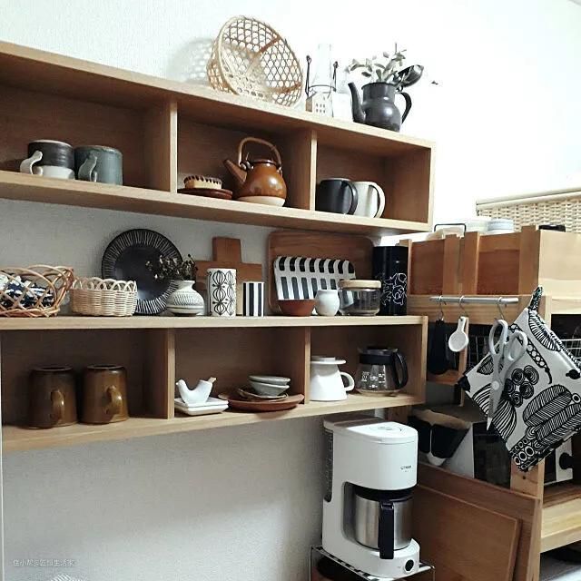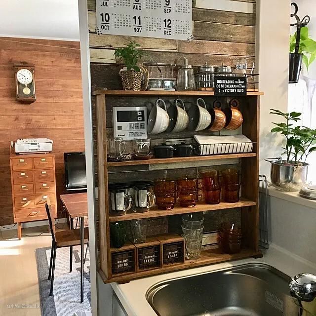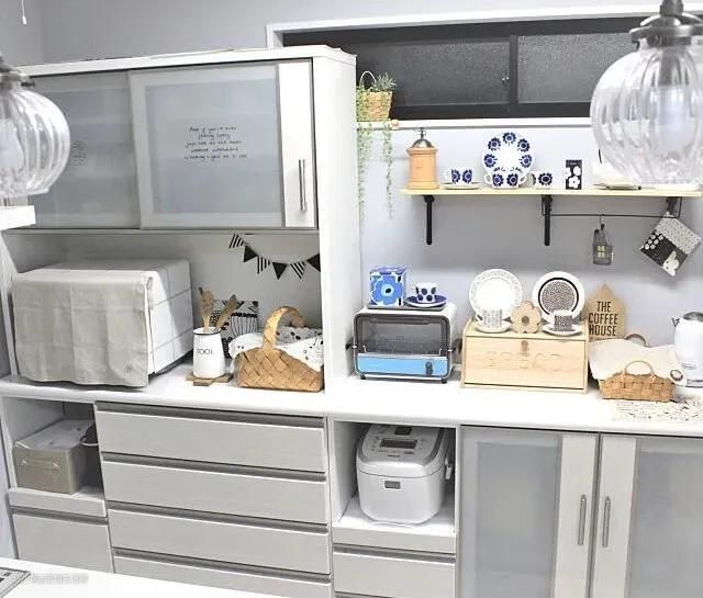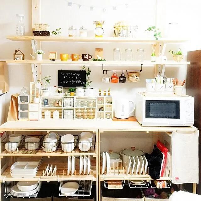 这位用户将精心挑选的餐具展示出来,等距放置物品,利落干净。另外,这边的橱柜是用户DIY的,根据身高,在容易取出的高度上设置了架子。不仅在外观上,在易用性上下足了功夫。