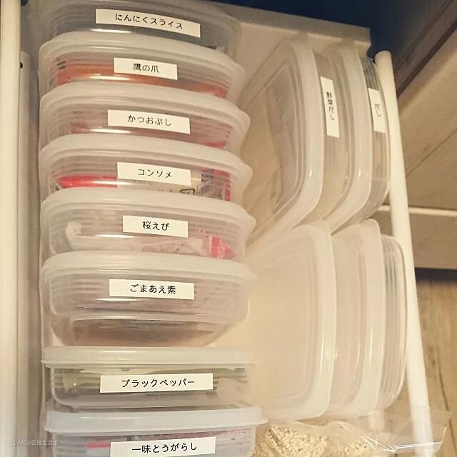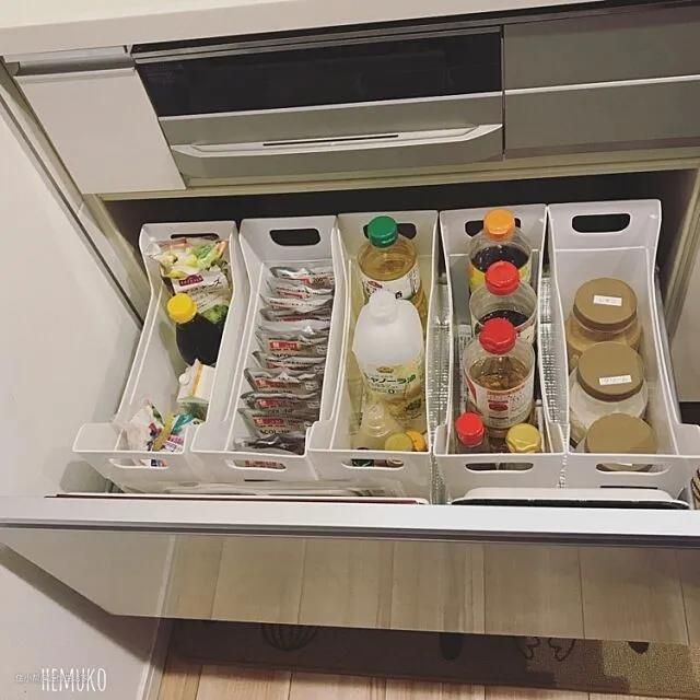 这位用户,把调味料重新装在干净的密封容器里。因为是透明的容器,打开抽屉的时候,马上就能知道里面是什么,很方便。另外,贴上标签的话,使用起来就更不需要犹豫是什么了。