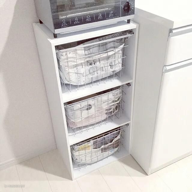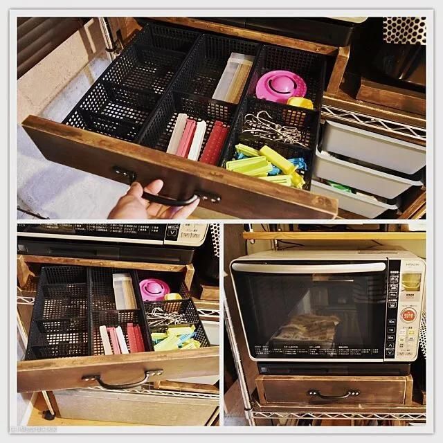 这位用户找到了能放进冰箱和墙壁间隙的微波炉收纳架。这个微波炉架可以配合收纳的东西改变搁板的位置,因此即使是高度有偏差的家电也能完全收纳。另外,电饭锅的下层,听说还能做成滑动式托盘拉出来。介意电饭锅热气的人也可放心使用。