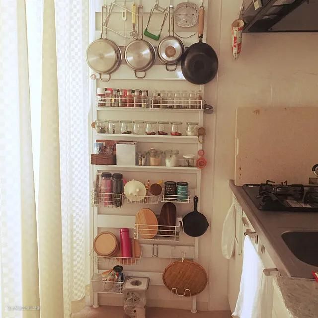 这位用户在厨房的边缘设置了货架。把调味料放在厨房炉灶附近,想用的时候马上就能使用,很方便。另外,在装饰架最下面的开门部分,按不同尺寸挂住指定垃圾袋进行收纳,即用即取。