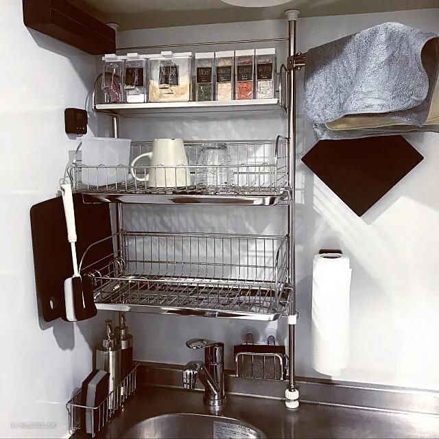 这位用户使用的是支撑式的沥水架,用来收纳调味品和杯子。设置在水槽上方的空间里,洗好的餐具放这里,就可以沥水了。