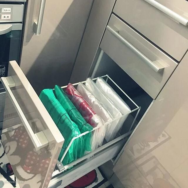 这位用户利用钢丝架来收纳垃圾袋,可以一张一张地取出袋子,拿取非常方便轻松,能收纳很多垃圾袋也是重点。