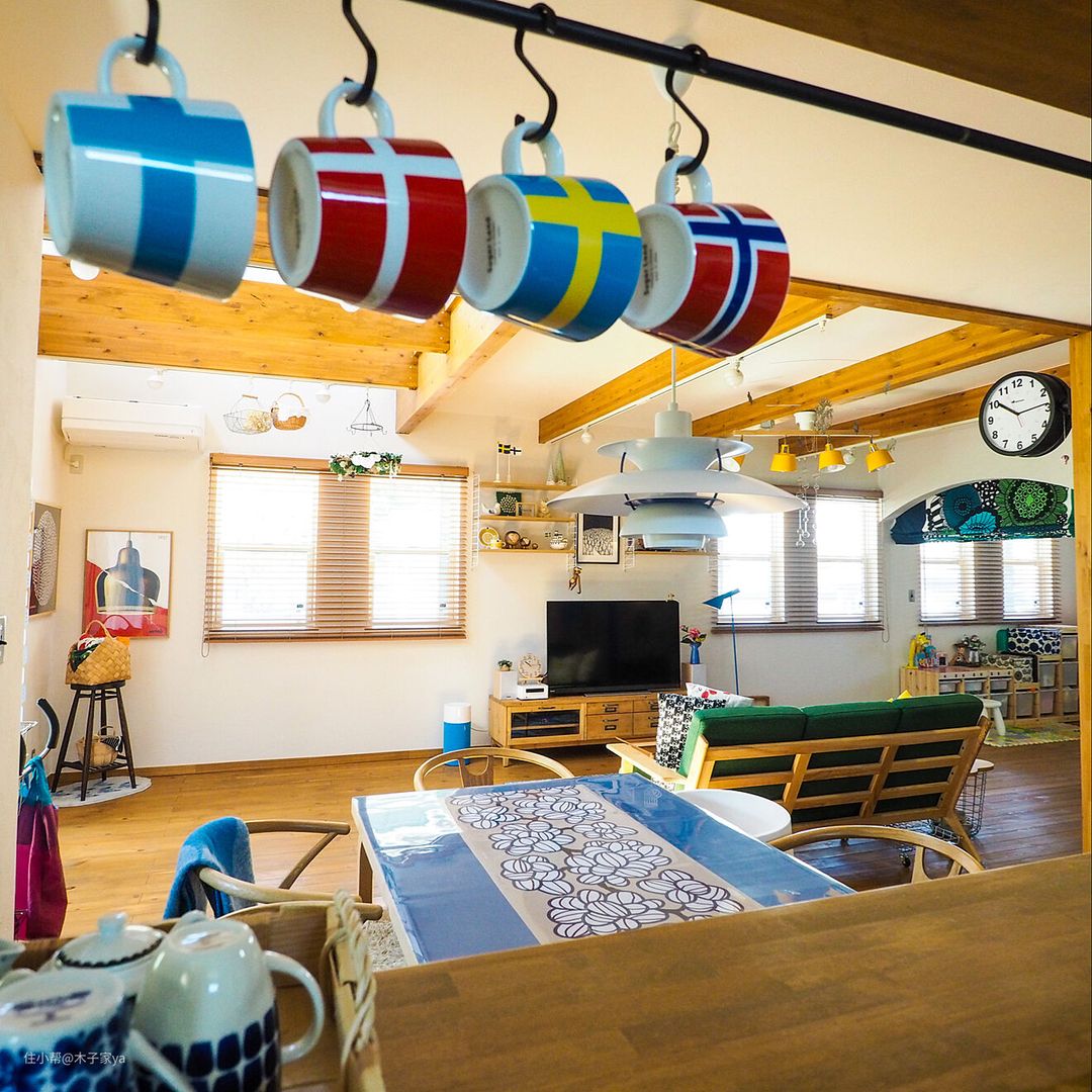 从厨房看向其他空间,上面放了一个挂杆,五彩的马克杯既可以装饰又可以方便收纳。
