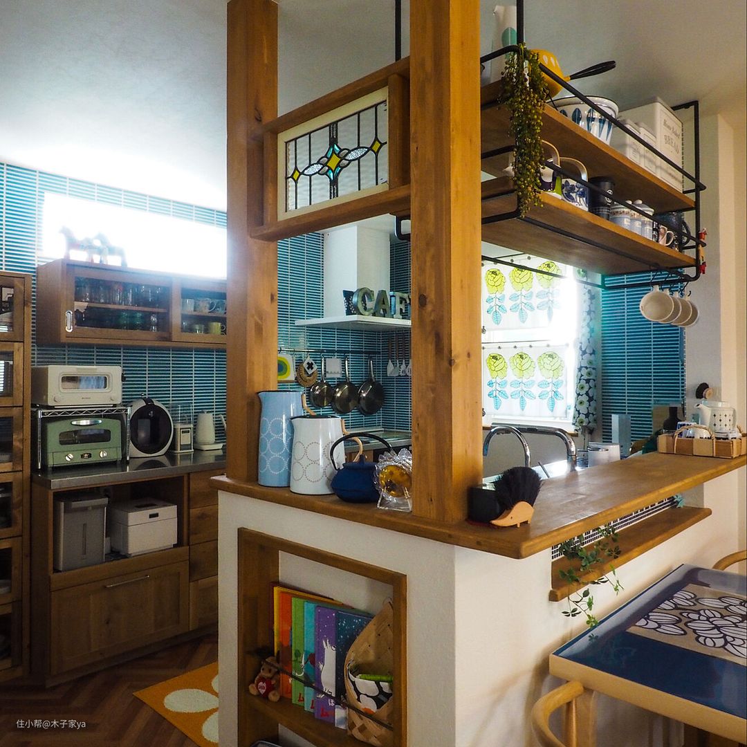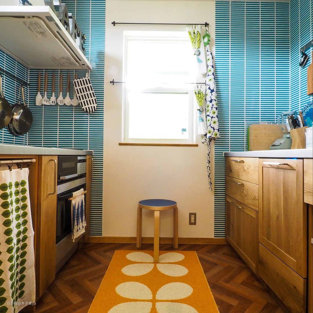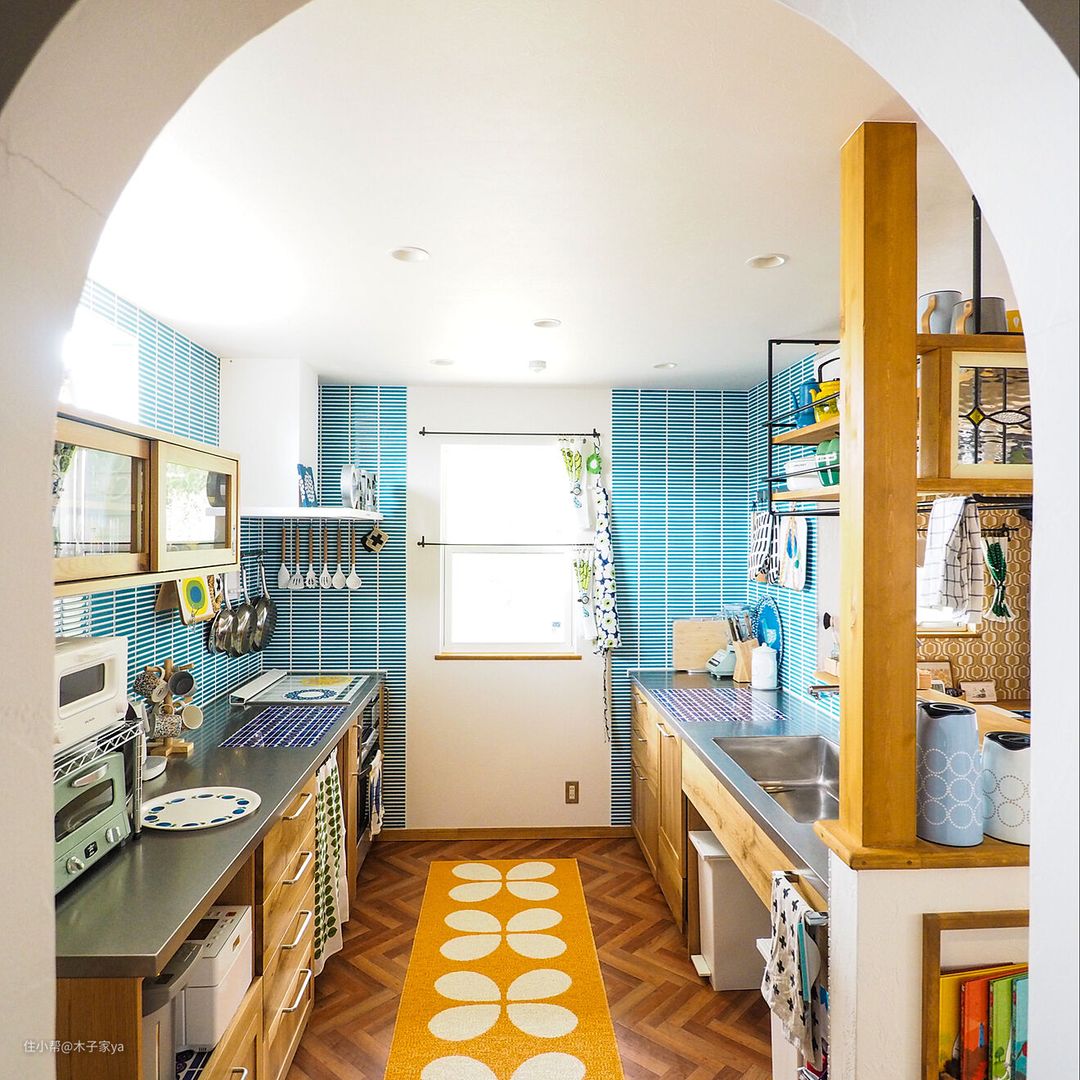 好喜欢这个日本人家的厨房,二字型厨房布局,墙面选用蓝色小砖,搭配原木色橱柜,不锈钢台面。整个厨房空间光线很好很舒服。