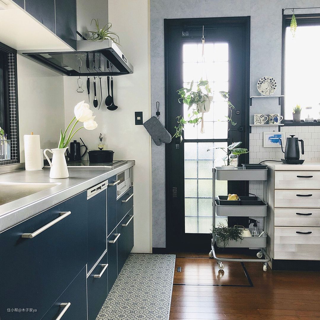 这套蓝色橱柜虽然看着很普通,但是也是很耐看,深蓝色橱柜搭配不锈钢台面,灰色移动小推车一字型橱柜很实用。