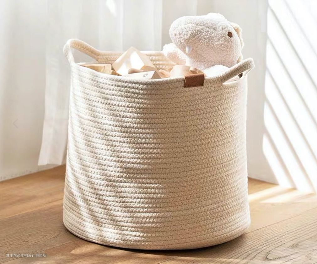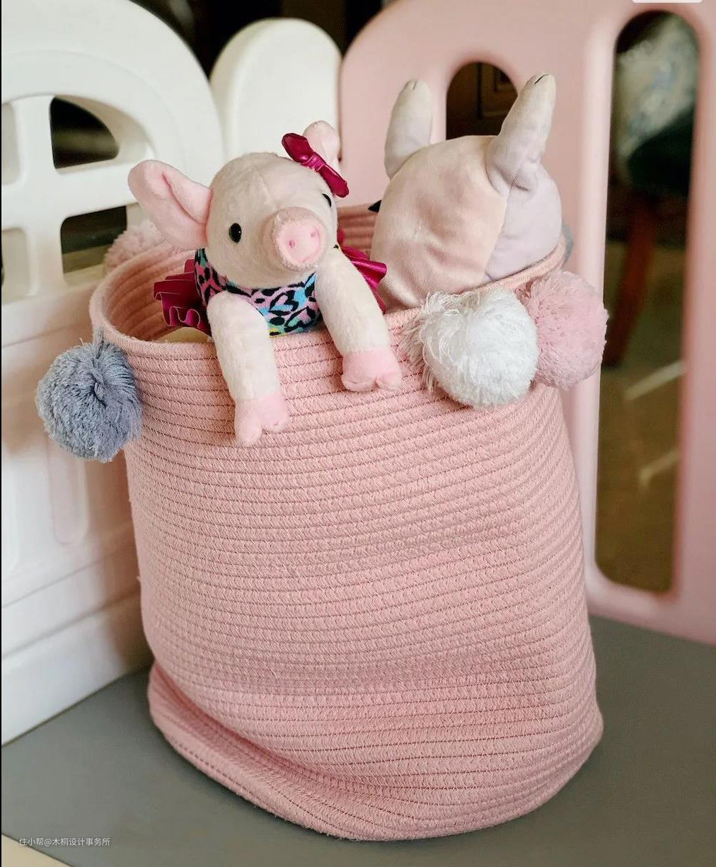 这个阶段,为了安全和方便就近收纳,可以选择较柔软的大号编织收纳篮,将玩具做粗类划分。为了刺激孩子感官发育,可以购买材质有所区别的不同篮筐(如麻布、绳编草编),不要追求整齐划一。