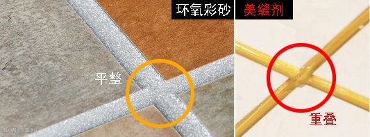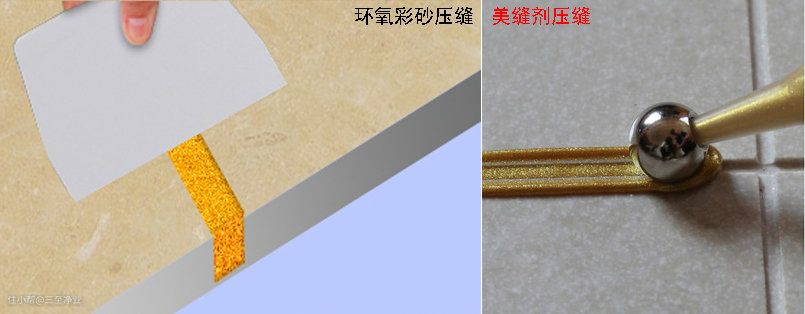 从上面的图可以看出来,环氧彩砂用刮板压出的缝和瓷砖面是平齐的,而美缝剂用滚珠压出的缝会有凹槽。如果砖缝有黑边,用美缝剂填缝会看到黑线,还有就是凹槽也会藏污纳垢,影响装饰效果。