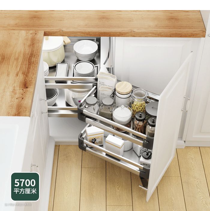 转角的位置一般不能充分利用,可以安装这样的转角拉篮,拿取方便,不用再蹲下拿取东西了。