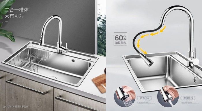 厨房一定要选SUS304食品级别的不锈钢材质的,建议装个大单盆,洗锅方便;最好装台中盆,无卫生死角;龙头材质要选黄铜的,功能选可伸缩的。
