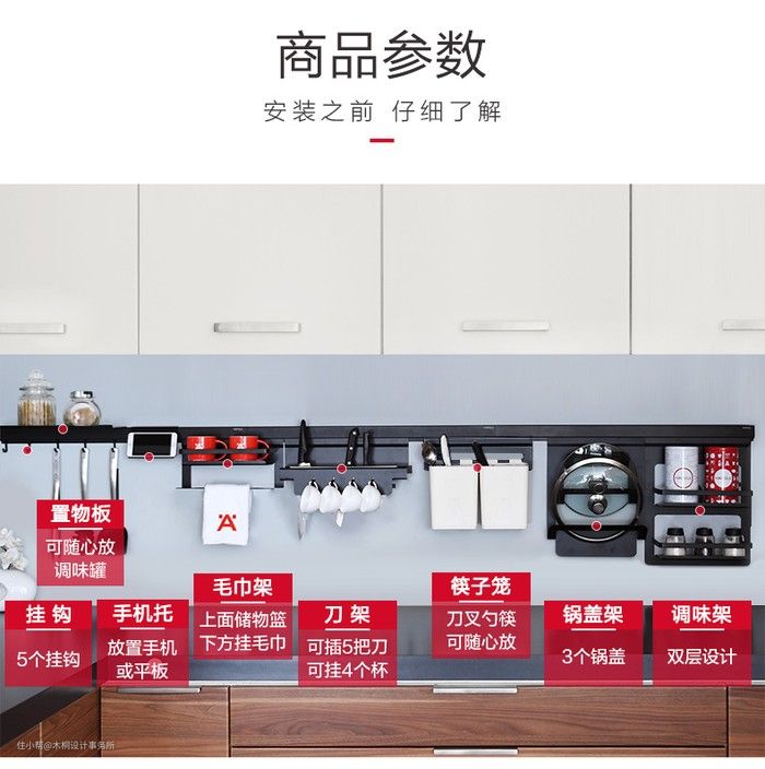 墙壁上的空间也不能浪费,安装一些五金挂件,可以收纳一小部分餐具或者清洁用品。